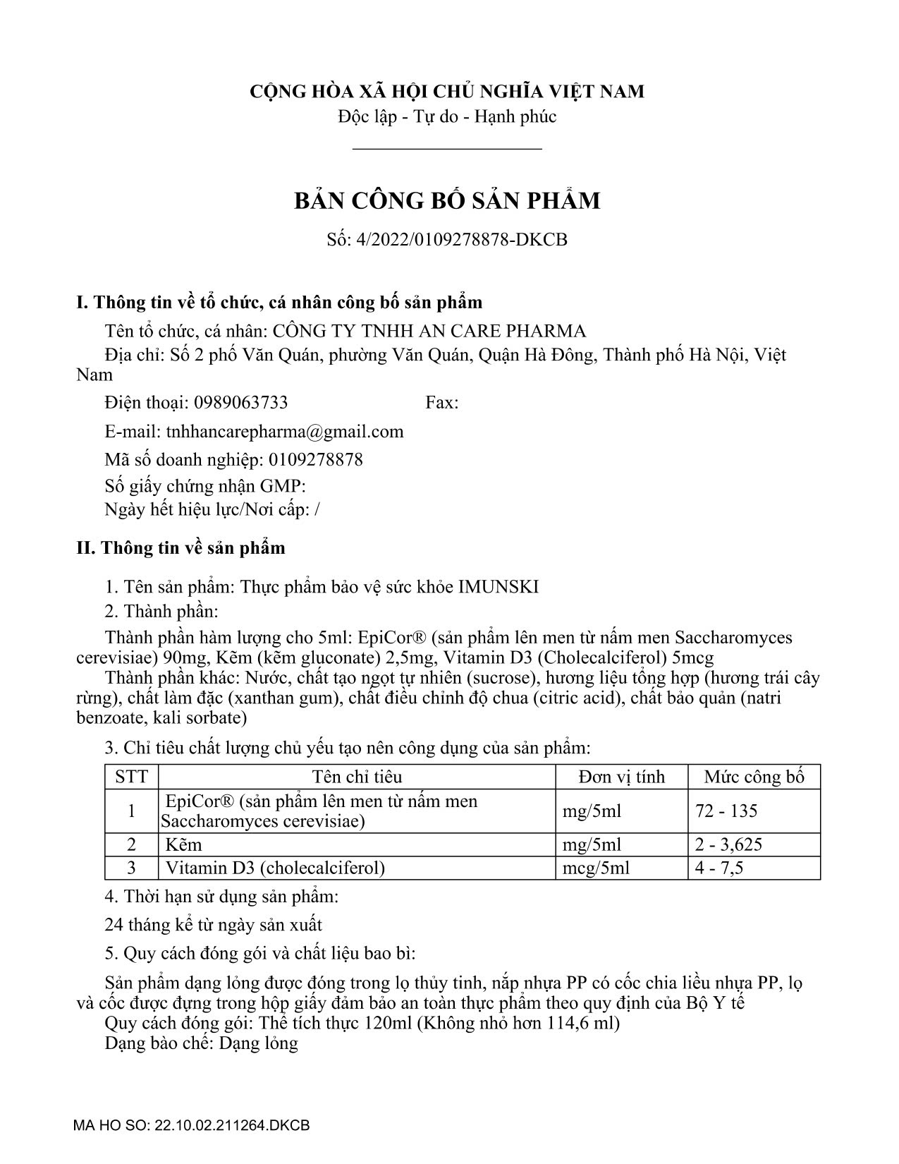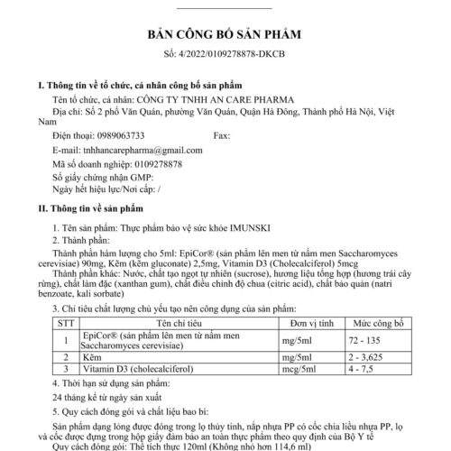 IMUNSKI hỗ trợ tăng cường sức đề kháng, với thành phần đột phá thế hệ mới EpiCor® – một sản phẩm lên men được chứng minh lâm sàng để hỗ trợ sức khỏe miễn dịch và đường ruột. Ngoài ra còn bổ sung vitamin D3 dạng vi nang và kẽm. Sản phẩm dành cho trẻ em, người lớn sức đề kháng kém, người bị cảm lạnh, cảm cúm cần tăng cường sức đề kháng.