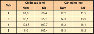 Trong những năm này, bé sẽ phát triển thể lực và chiều cao khá nhanh. Bạn có thể tham khảo bảng thể hiện sự phát triển chiều cao và cân nặng của trẻ 2 – 5 tuổi sau: