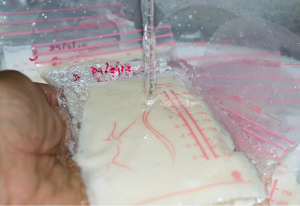 • Xả nước rã đông sữa: Xả nước rã đông sữa bằng cách xả bịch sữa đông dưới vòi nước mát để sữa được rã đông một cách từ từ không làm hỏng, làm mất đi các dưỡng chất có trong sữa. Sau đó, khi sữa đã không còn đông đá, bạn hãy từ từ tăng nhiệt độ nước để làm ấm dần sữa. Bé có thể uống sữa ở nhiệt độ bình thường, nhưng nếu bé kén ăn thì bạn nên hem sữa ấm trước khi cho bé uống. Còn trong trường hợp bạn đã để sữa xuống ngăn mát từ hôm trước và sữa đã tan đá thì bạn chỉ cần xả bịch sữa dưới vòi nước ấm là được.